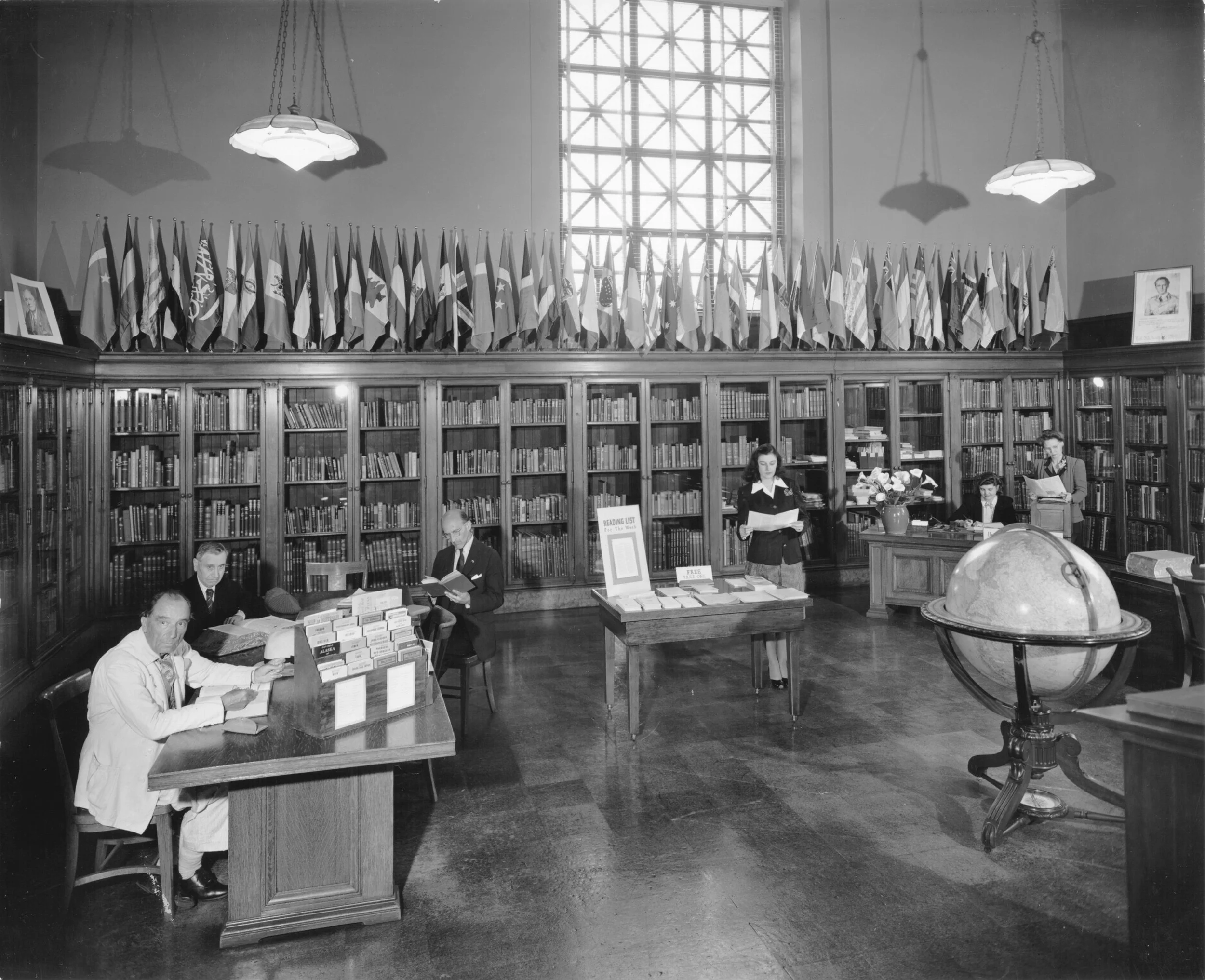 But back during the 1945 United Nations Conference, the library was in a different building, and it played a special role. In what is now the Asian Art Museum, there was a private room just for attending delegates to use—all 850 of them. They even had their own special library cards.