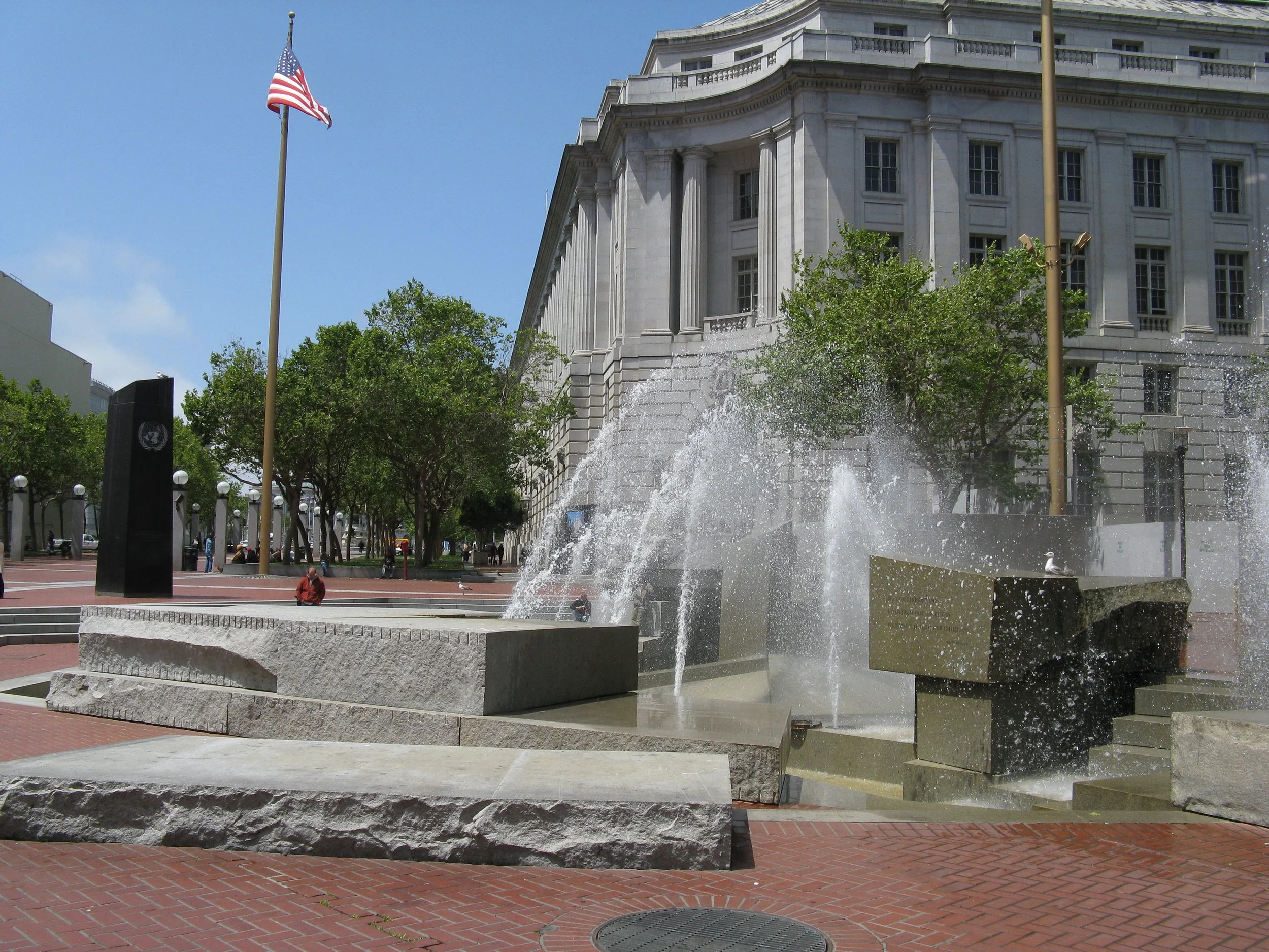 What began as a plaza and fountain designed by architects Larence Halprin, Mario Ciampi, and John Carl Warnecke, has grown into a living, breathing monument. This growth also makes it difficult to know where to begin. It’s best to start with the fountain, near the Market Street side entrance to the plaza. This fountain was built alongside the original plaza. Granite slabs in the fountain are meant to represent the continents of Earth. A central block, the lowest one, symbolizes a mythical lost continent. Originally, the fountain was designed to flood and drain the basin on a 2-minute cycle to honor the ocean tides.